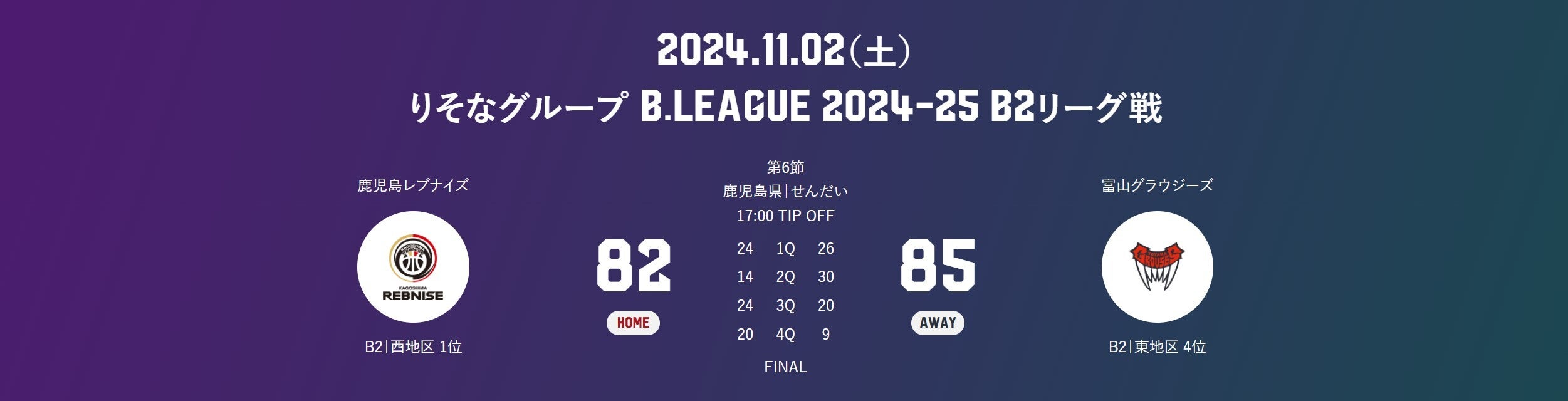 本日(11/2)、りそなグループ B.LEAGUE 2024-25シーズン 第6節 GAME1 富山グラウジーズと対戦しました。試合結果をお知らせします。