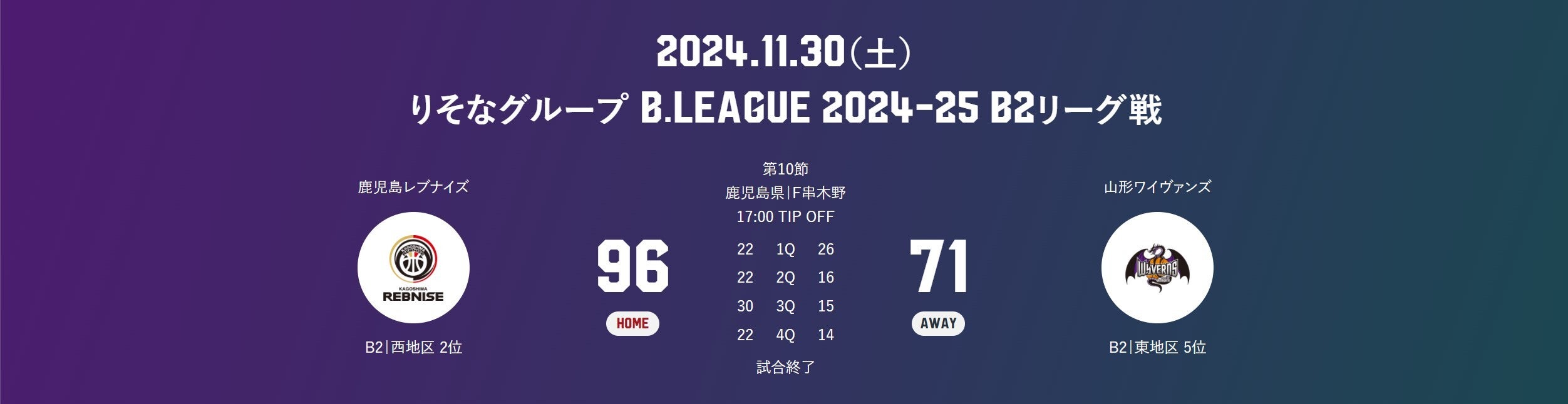 本日(11/30)、りそなグループ B.LEAGUE 2024-25シーズン 第10節 GAME1 山形ワイヴァンスと対戦しました。試合結果をお知らせします。