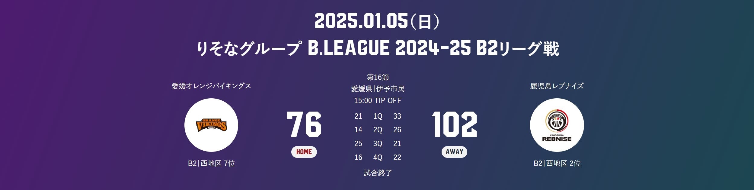 本日(1/5)、りそなグループ B.LEAGUE 2024-25シーズン 第16節 愛媛オレンジバイキングスと対戦しました。試合結果をお知らせします。