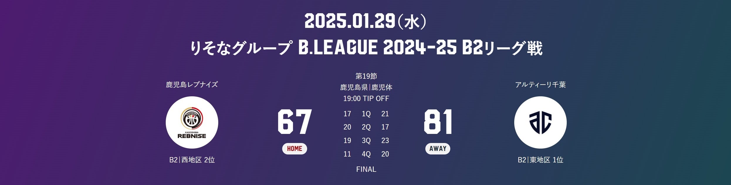本日(1/29)、りそなグループ B.LEAGUE 2024-25シーズン 第19節 アルティーリ千葉と対戦しました。試合結果をお知らせします。