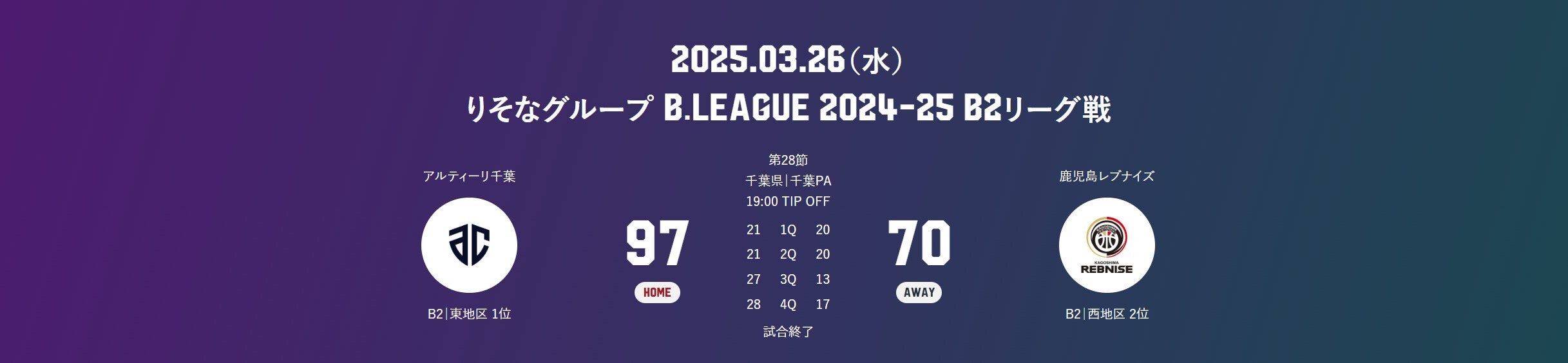 【レブナイズ速報】りそなグループ B.LEAGUE 2024-25シーズン 第28節(3/26)試合結果のお知らせ