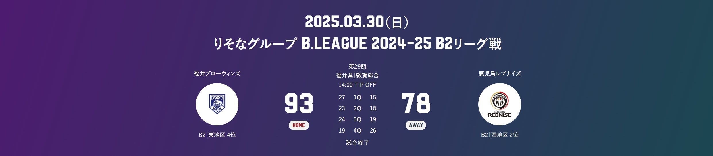 本日(3/30)、りそなグループ B.LEAGUE 2024-25シーズン 第29節 AWAY 敦賀市総合運動公園体育館で福井ブローウィンズと対戦しました。試合結果をお知らせします。