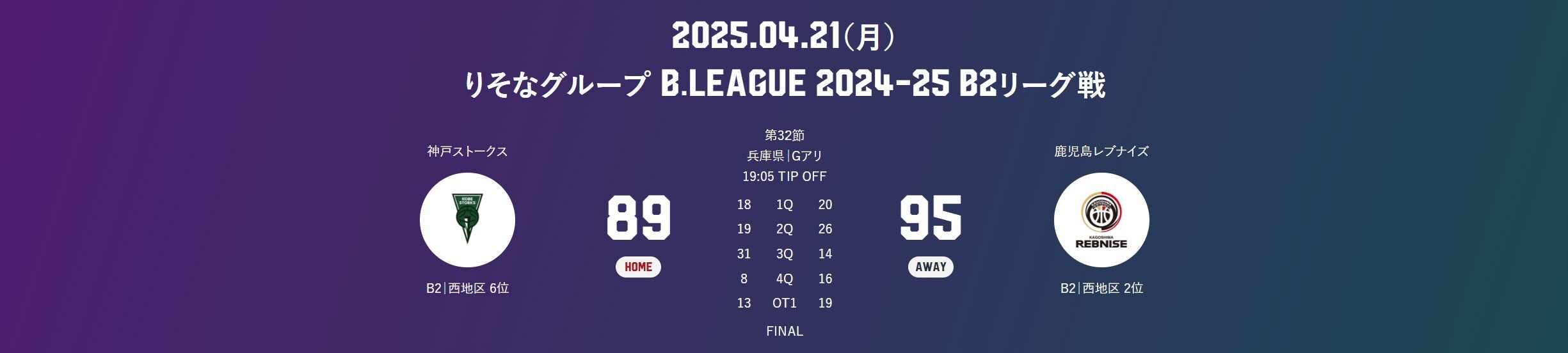 本日(4/21)、りそなグループ B.LEAGUE 2024-25シーズン 第32節 GLION ARENA KOBEで神戸ストークスと対戦しました。試合結果をお知らせします。