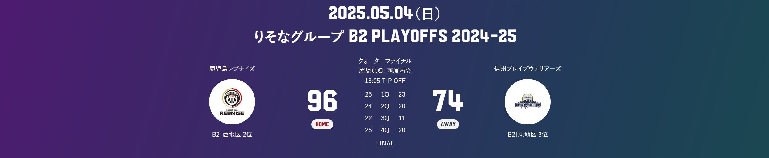 本日(5/4)、西原商会アリーナにて「りそなグループ B2 PLAYOFFS QUARTERFINALS GAME2 vs信州ブレイブウォリアーズ」との試合結果をお知らせします。