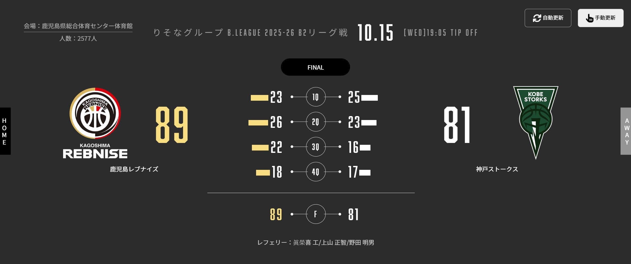本日(10/15)、りそなグループ B.LEAGUE 2025-26シーズン 第3節 鹿児島県総合体育センター体育館で神戸ストークスと対戦しました。試合結果をお知らせします。