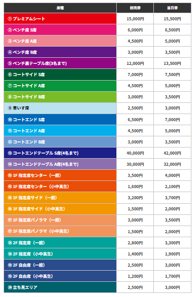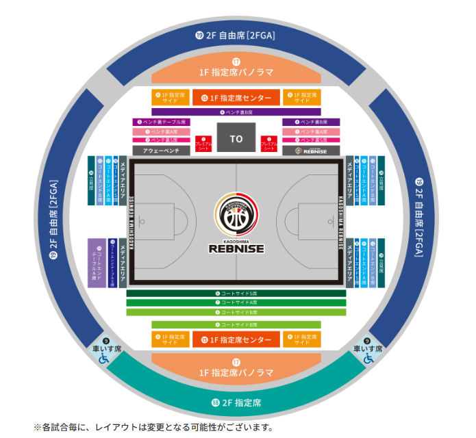 1F車いす席の需要が低下していることから、西原商会アリーナの試合では1F車いす席の設置を撤廃いたします。2F車いす席をご利用ください。