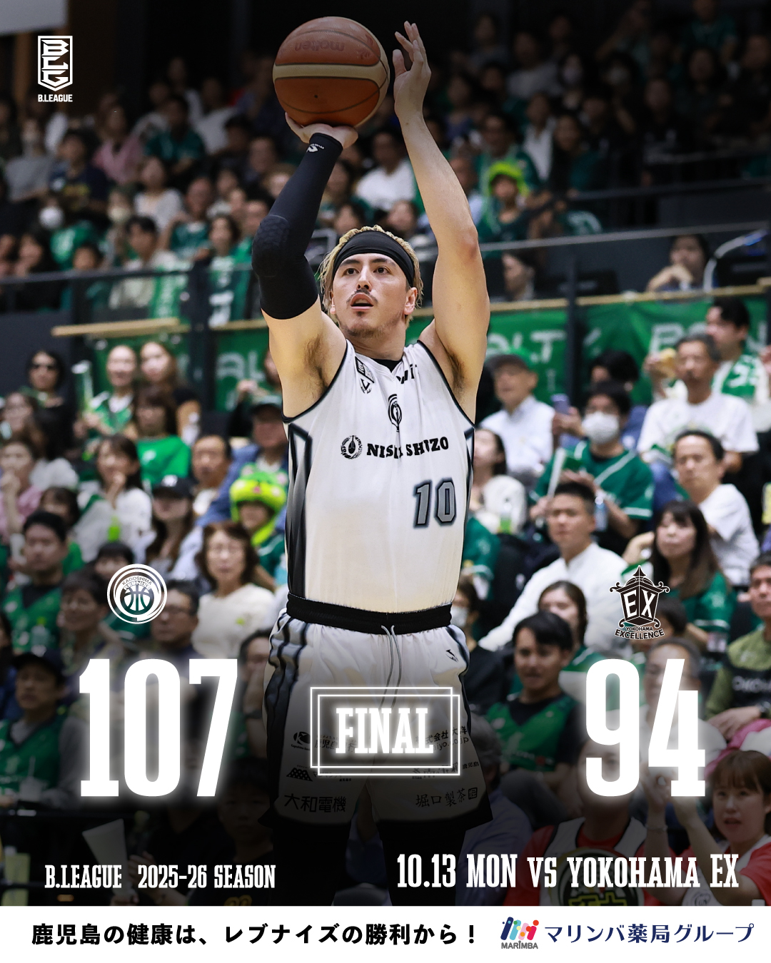 【鹿児島レブナイズ速報】WIN!WIN!WIN!3連勝!りそなグループ B.LEAGUE 2024-25シーズン 第5節 GAME1(10/26)試合結果のお知らせ